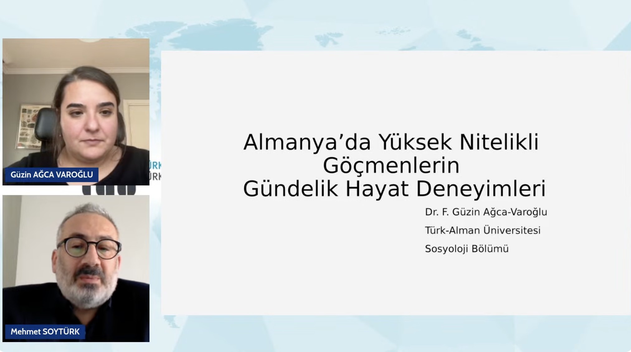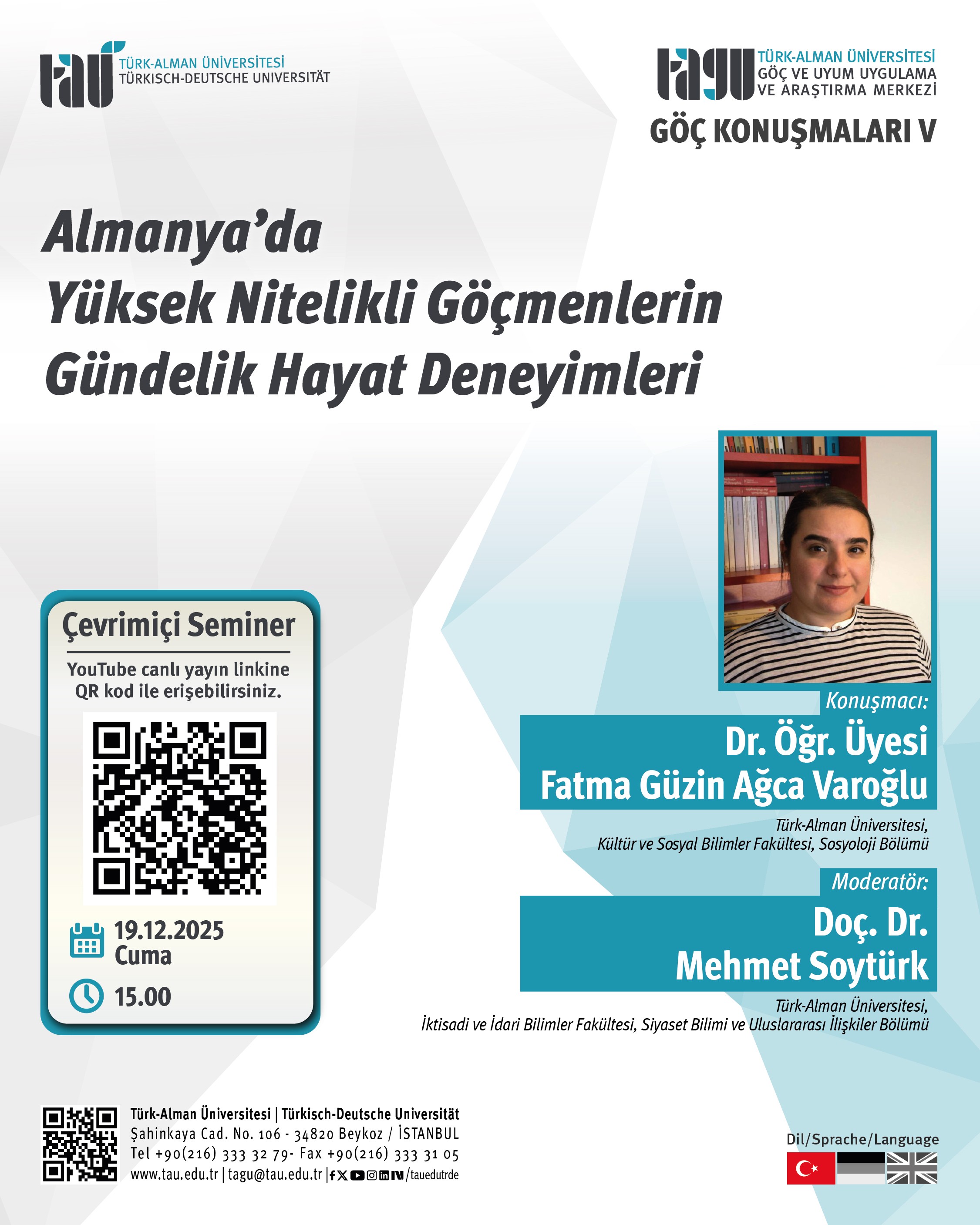 Dr. Fatma Güzin Ağca Varoğlu, Dozentin am Institut für Soziologie der Fakultät für Kultur- und Sozialwissenschaften unserer Universität, war Referentin, und moderiert von Assoc. Prof. Dr. Mehmet Soytürk, Dozent am Fachbereich Politikwissenschaft und Internationale Beziehungen der Fakultät für Wirtschafts- und Verwaltungswissenschaften, fand am 19. Dezember 2025 live auf YouTube statt. Ağca Varoğlu wertete die Daten aus, die sie bei ihren Gesprächen in Deutschland gesammelt hatte. Bei der Veranstaltung wurden auch die Unterschiede zwischen den Erfahrungen der Vergangenheit und der Gegenwart beleuchtet.