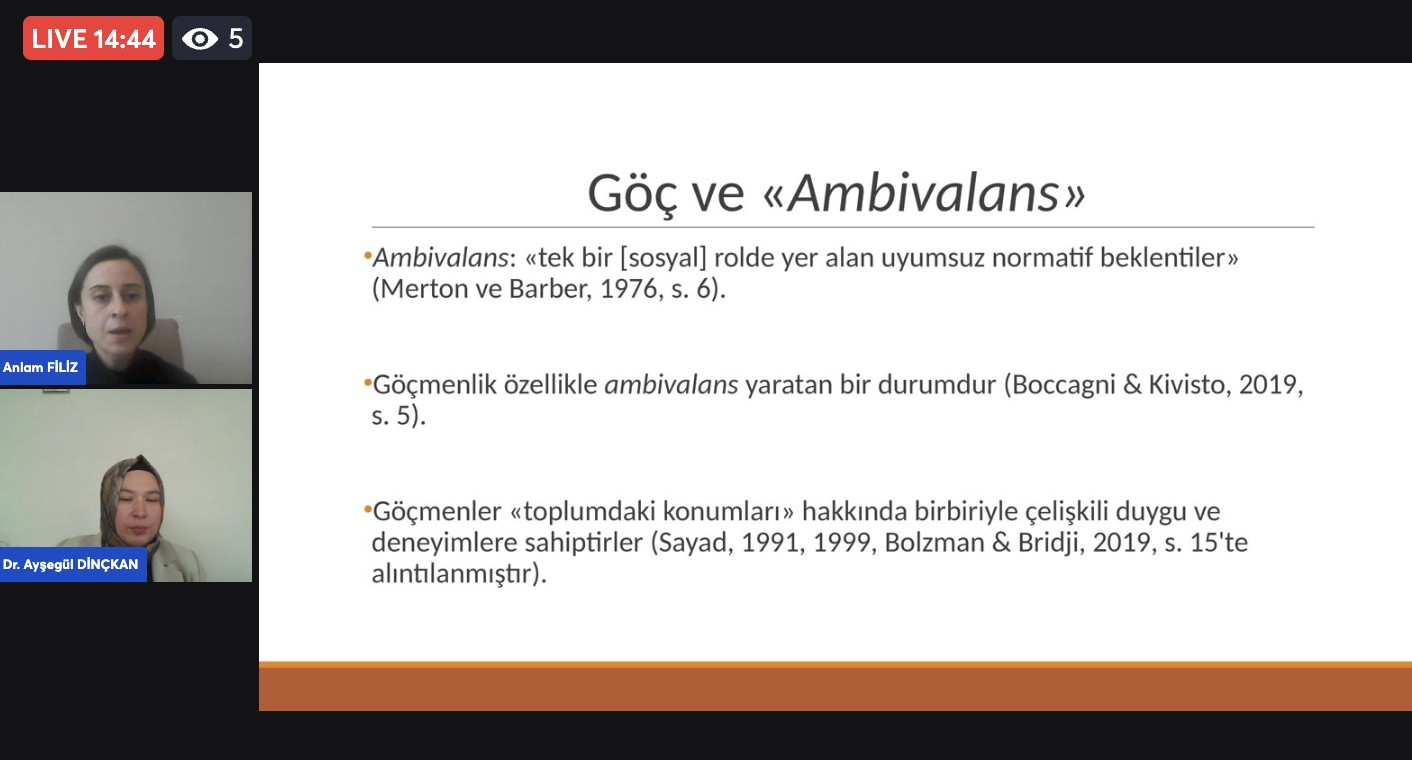 Die Veranstaltung mit dem Titel "Migration aus der Perspektive der Soziologie der Zukunft", bei der Dr. Anlam Filiz, Assistenzprofessorin am Institut für Soziologie der Fakultät für Kultur- und Sozialwissenschaften unserer Universität, als Referentin und Dr. Ayşegül Dinçkan, Assistenzprofessorin am Institut für Politikwissenschaft und Internationale Beziehungen der Fakultät für Wirtschafts- und Verwaltungswissenschaften, als Moderatorin, stattfand, wurde am 27. Januar 2026 live auf YouTube übertragen. Dr. Filiz präsentierte ihre Ergebnisse, die auf Daten aus ihrer Feldforschung basieren.