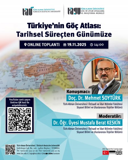 Doç. Dr. Mehmet Soytürk'ün konuşmacı Dr. Öğr. Üyesi Mustafa Berat Keskin'in moderatör olduğu "Türkiye'nin Göç Atlası: Tarihsel Süreçten Günümüze" başlıklı toplantı 19 Kasım 2025 tarihinde Youtube üzerinden canlı şekilde gerçekleşti.